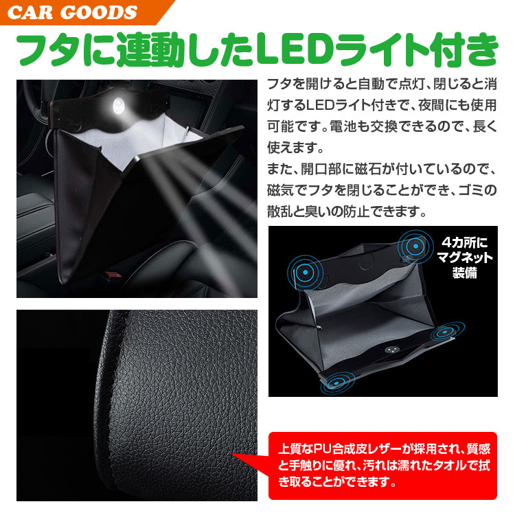 さらにフタの開け締めでLEDライトが点灯するので、暗い車内でも使えます。